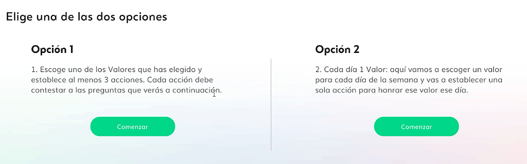 - La Opción 1: esta opción es la más indicada cuando hay un valor que es especialmente relevante para ti y necesitas focalizarse en él. También cuando hay un objetivo claro para definir cada paso en el tiempo hasta su consecución final. Por ejemplo, si mis valores están relacionados con emprender un negocio, aprender un instrumento, un idioma, etc. El juego, nos va a facilitar crear distintas acciones con varias preguntas para ayudarnos a concretar. Estas preguntas son: