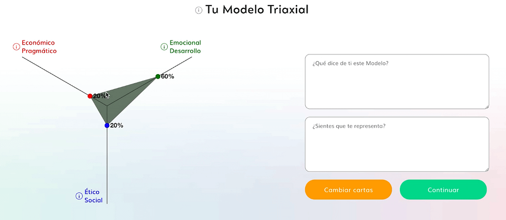 En la siguiente fase, se trasladará cada elección y puntuación de valores que hayas determinado a la plasmación de tu modelo triaxial. Por definirlo de una manera sencilla, este modelo es una instantánea de tus valores personales en base a tres ejes: