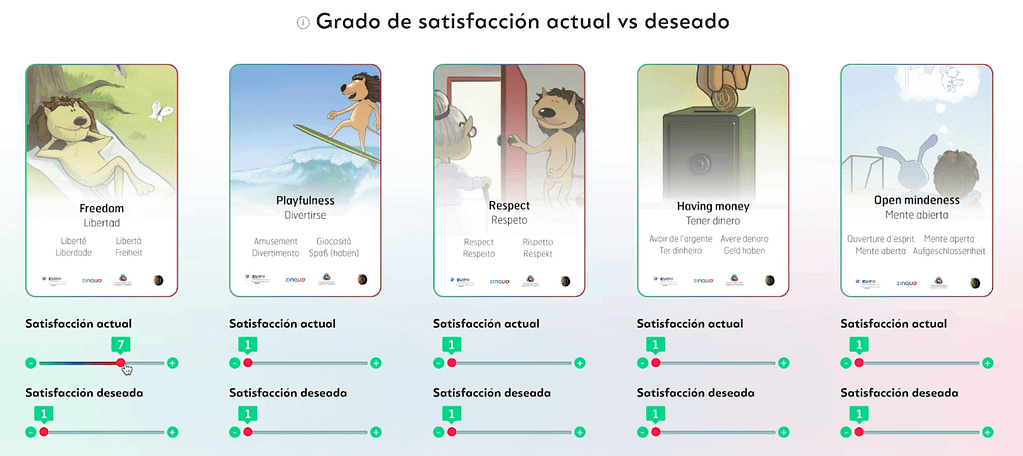 En esta pantalla, tendrás que puntuar del 1 al 10 cada valor respecto a tu satisfacción actual y el que te gustaría tener a 3 ó 6 meses vista.